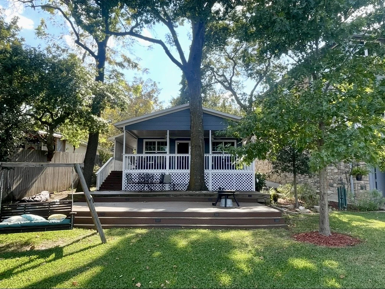 Thirty five years later, following the death of my husband, my need returned for a place of solace and peace. I yearned for the days that I had spent at the lake home of my parents. On a whim one day, I found myself talking to the realtor who had sold my parents house, and I was told that there was a property available, not far from our old family retreat house. It was perfect, and even better, with a big porch, a remodeled kitchen, and improvements that I didn’t have to make. It was move-in ready, except for some painting and a bit of clean up. After enjoying my new retreat each weekend, and finding new friends in a welcoming community of “lakers”, I decided to also build a house next door, and to live at Lake Weatherford permanently. The “Cottage”, with two bedrooms and two baths, was perfect for times when my family came for visits. And, I think, it is a great place to spend time “away from the world”, to experience God’s presence watching the movement of the water, the birds, or just sitting on the porch. Both houses have been dedicated to God’s use, in order that others may receive His gifts of restoration, renewal, and feel His peace in mind, body, and spirit.